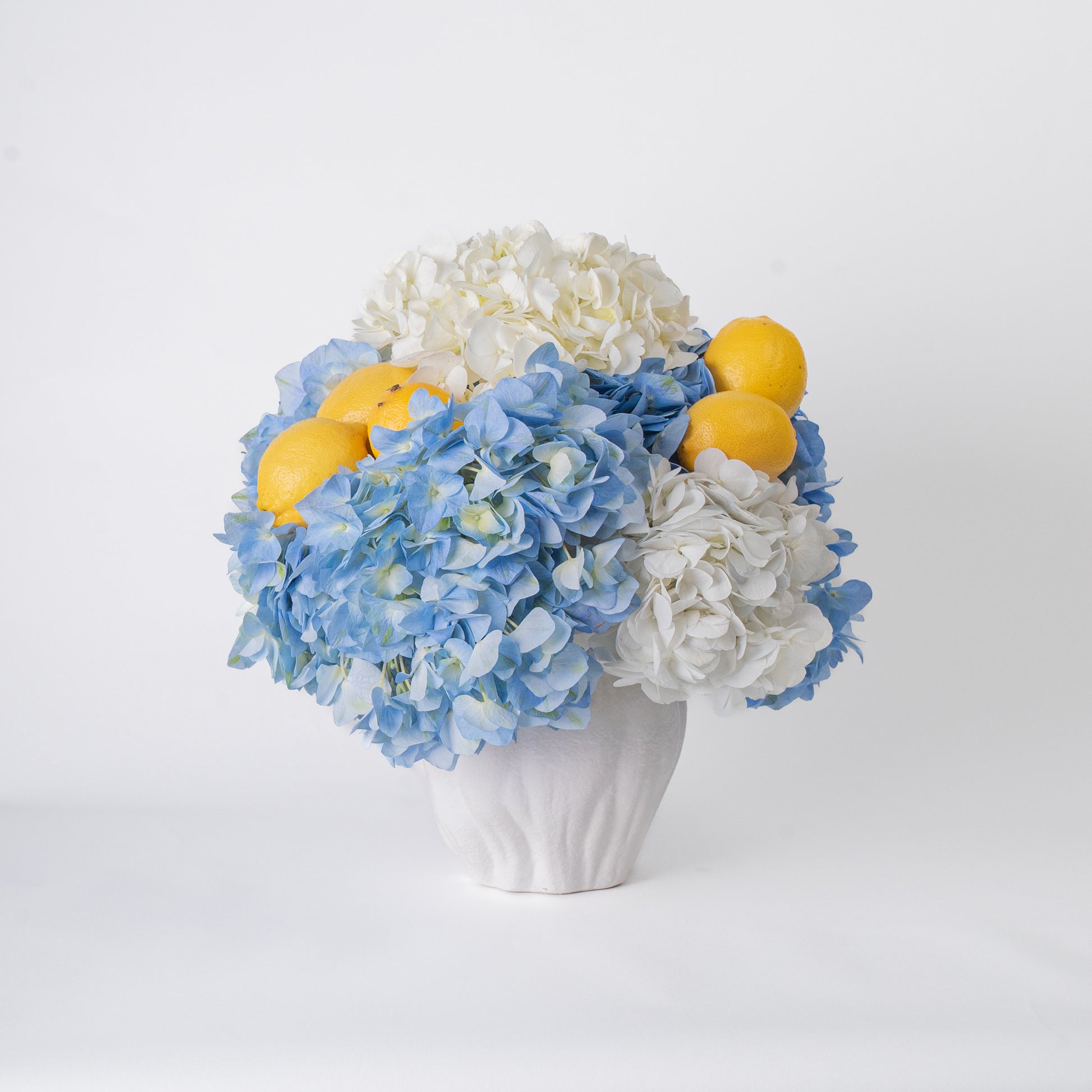A lemony zesty signature summer arrangment with blue and white hydrangea