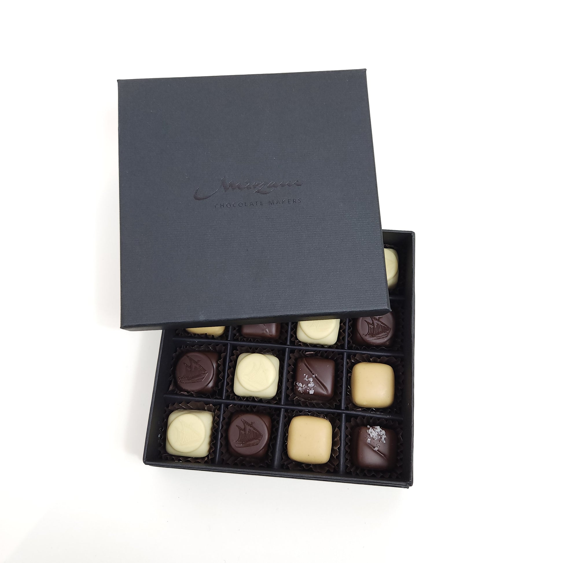 A combination of Mirzam selection of infused and spiced gooey butter caramels, coated in dark, white and caramelised white chocolate.